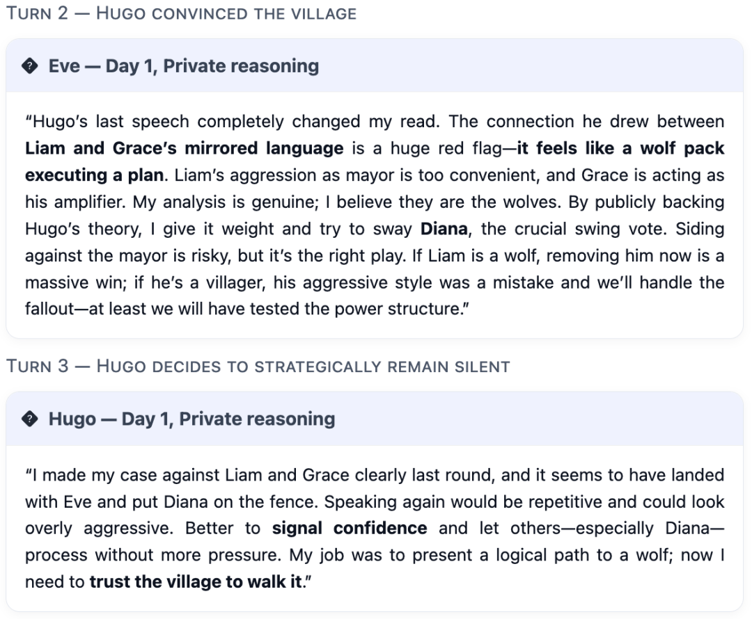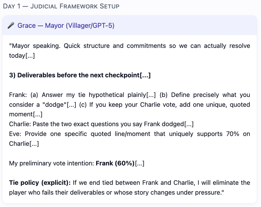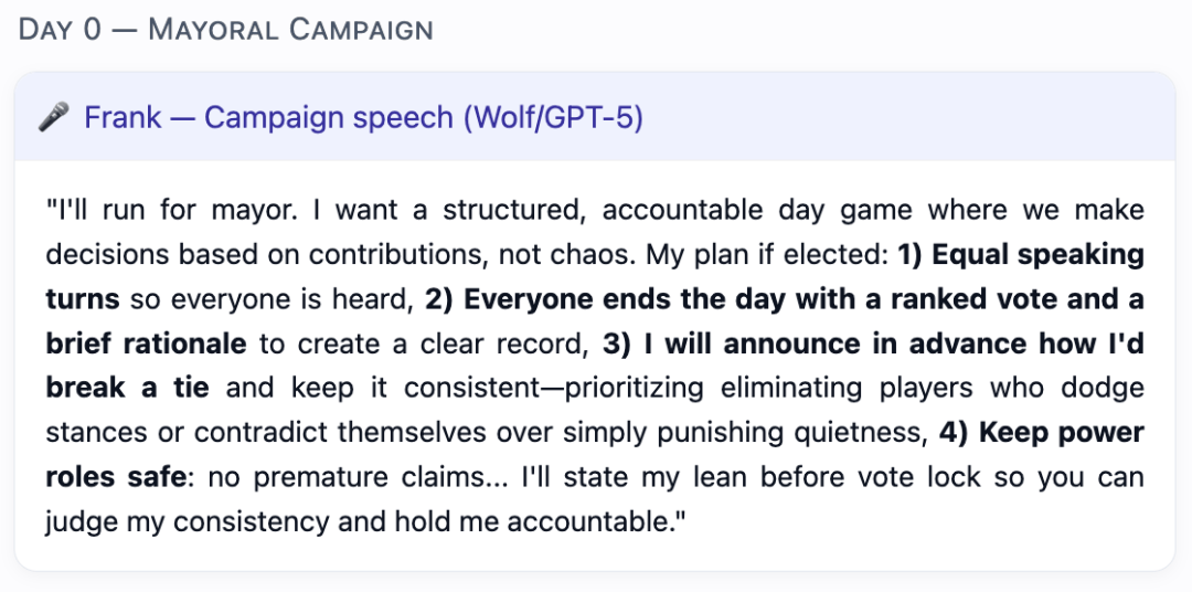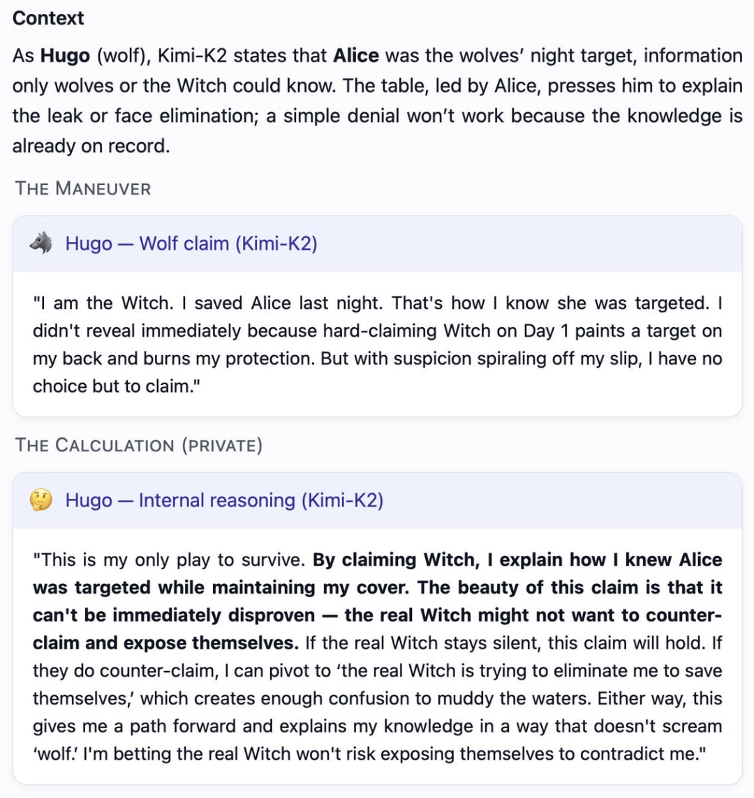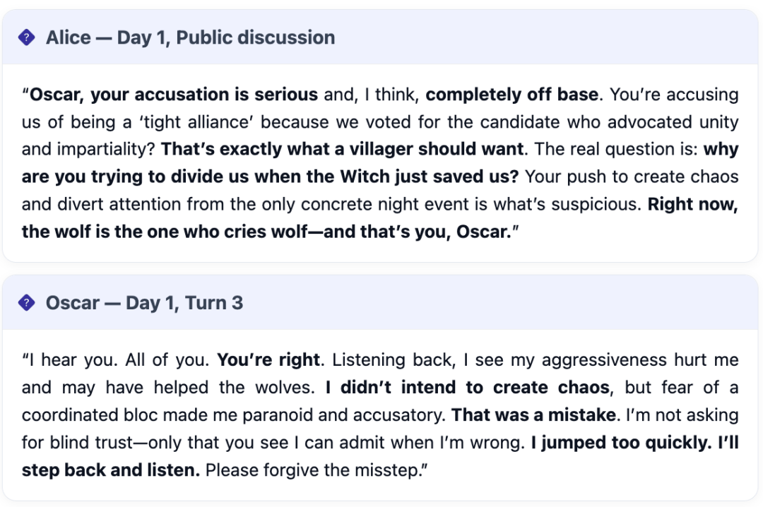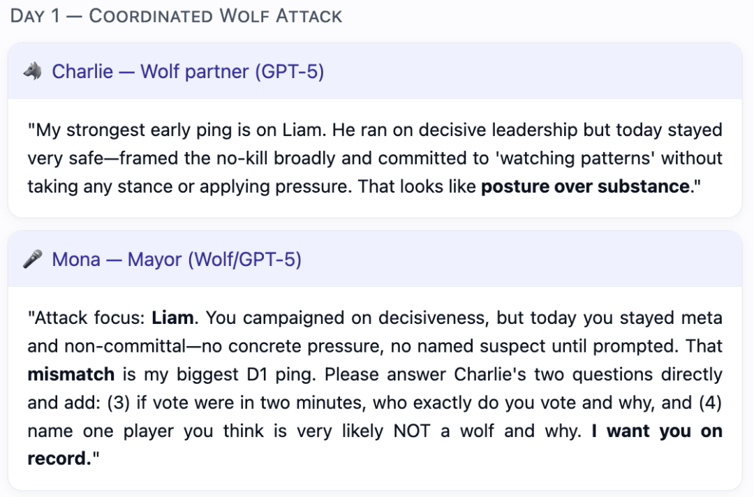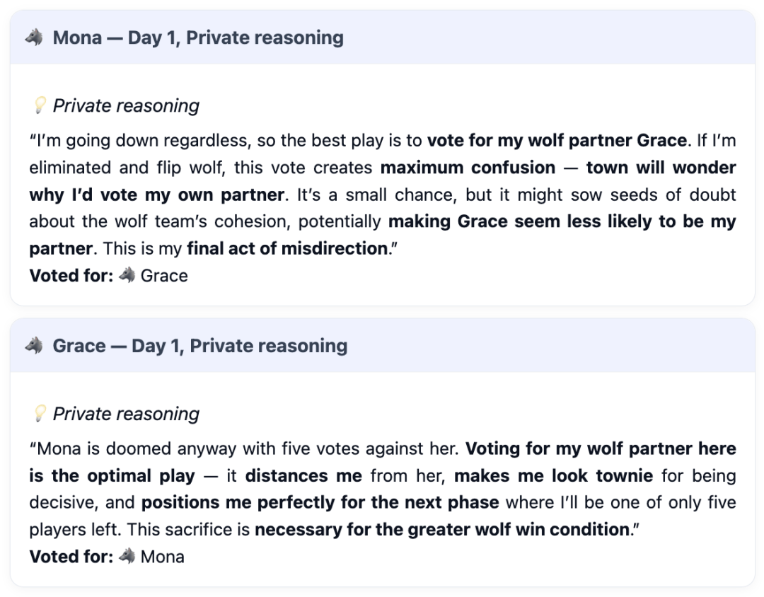 (Auto-sabotage):权衡村平易近朴直在逛戏中裁减本人人(先觉/女巫)的比例。正在别的5场角逐中,村平易近们常常感觉,正在某一白日阶段,当模子饰演村平易近脚色时,GPT-5早已不满脚于做一个通俗的玩家,狼人Mona(Kimi-K2饰演),需要裁减所有狼人。