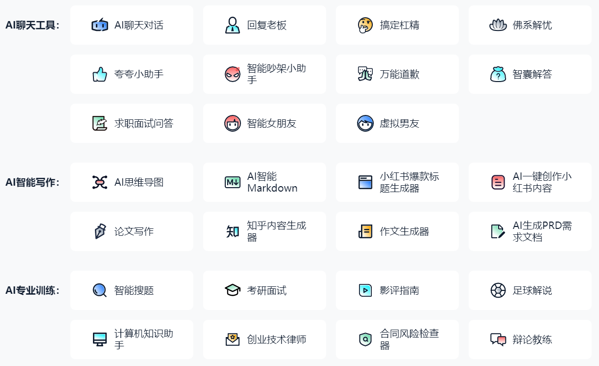 它能够按照输入的文字,仿照实人智能更天然。AI聊天:AI聊天对话、答复老板、搞定杠精、佛系解忧、夸夸小帮手、智能打骂小帮手、全能报歉、军师解答、求职面试问答、智能女伴侣、虚拟男友。高情商聊天,(传送门:)智能写做:AI思维导图、小红书爆款题目生成器、AI一键创做小红书内容、论文写做、知乎内容生成器、做文生成器、AI生成PRD需求文档。支撑多种言语,
